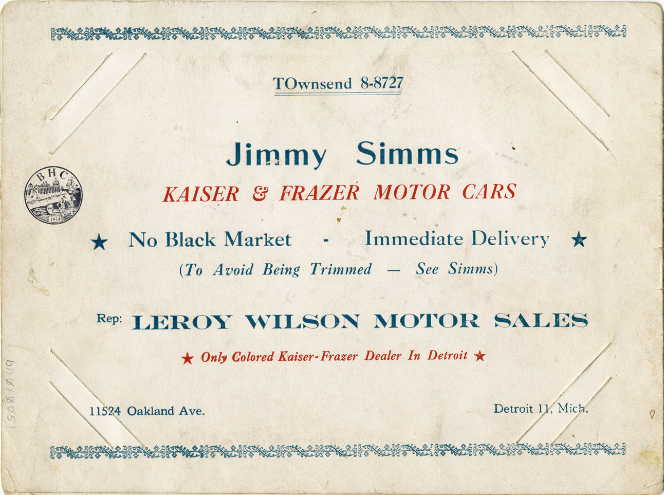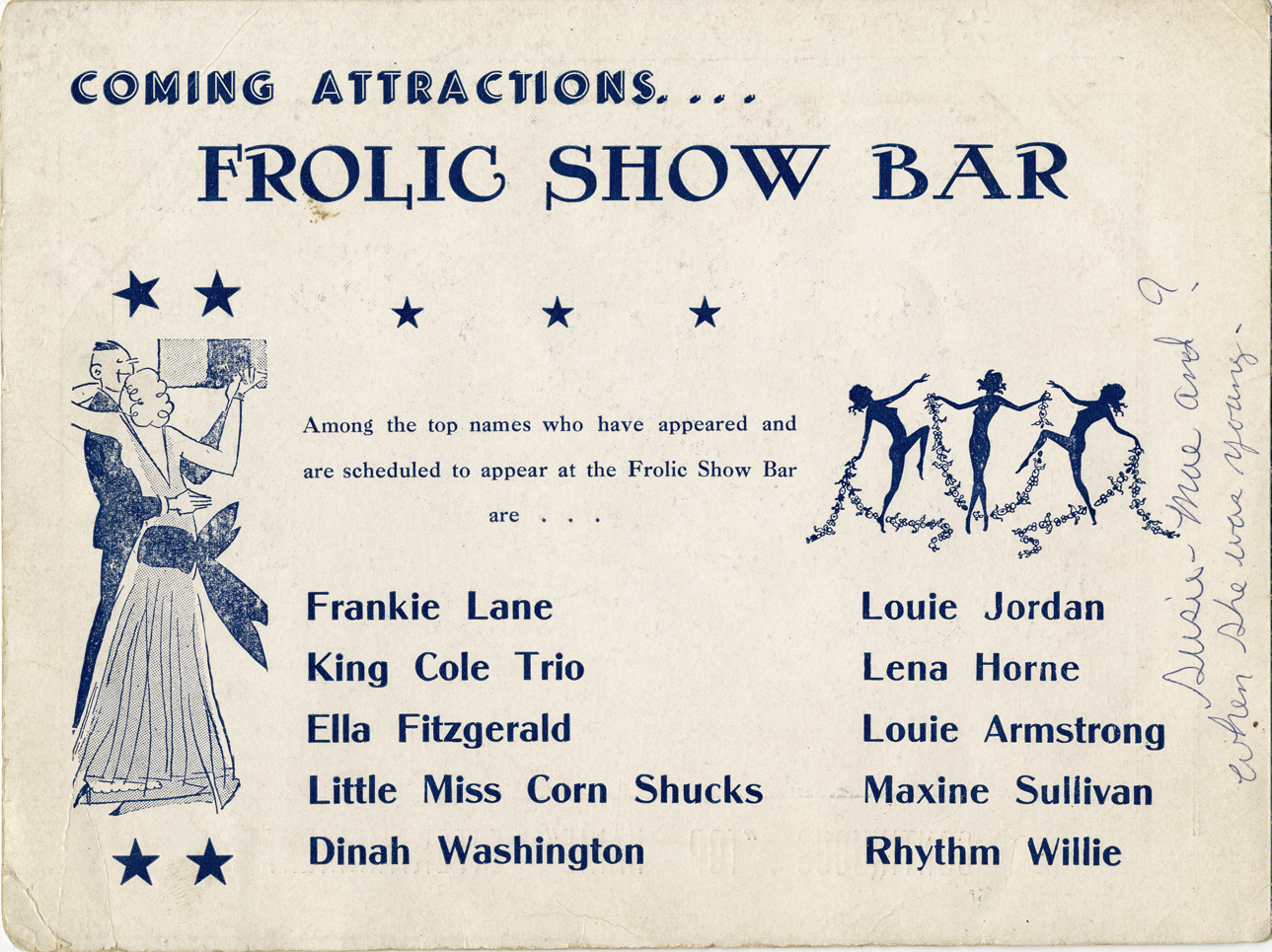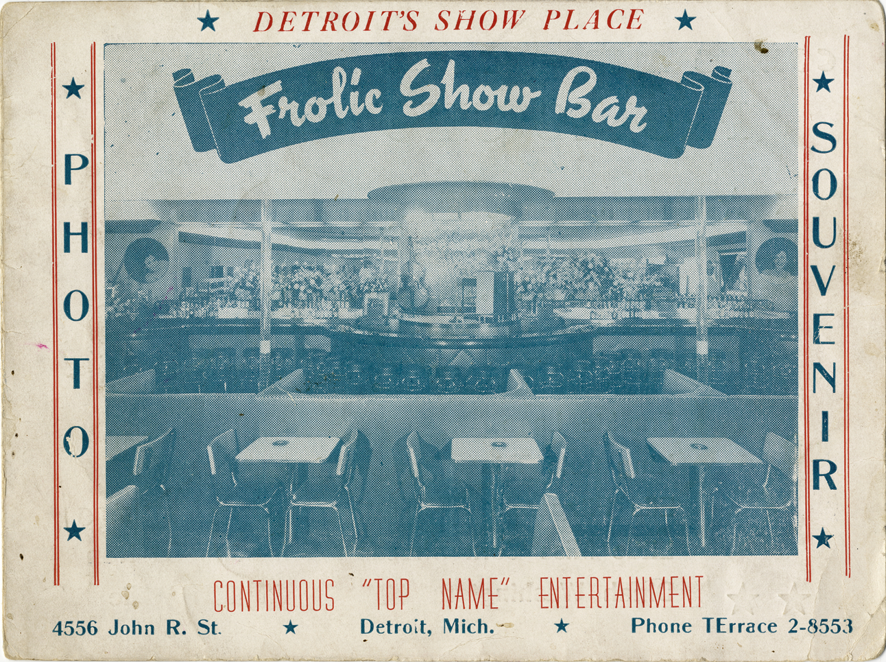 Souvenir photograph folder from Frolic Show Bar in Detroit, Michigan. Cover depicts interior of nightclub, with tables, chairs and bar. Printed on front: "Frolic Show Bar, Detroit's show place, continuous top name entertainment. Photo souvenir. 4556 John R. St., Detroit, Mich., Phone TErrace 2-8553." Folder includes list of coming attractions and advertisement for Jimmy Simms, dealer for Kaiser and Frazer motor cars. Photograph is missing from folder.