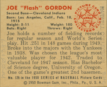 Portrait of Joe Gordon, second baseman for the Cleveland Indians. Bowman series. Printed on back: "Joe 'Flash' Gordon. Second base, Cleveland Indians. Born: Los Angeles, Calif., Feb. 18, 1915. Height: 5-11. Weight: 180. Bats: right. Throws: right. Joe holds a number of fielding records for regular season and World's Series play. Hit .251 in 148 games during 1949. Broke into the majors with the Yankees in 1938. Was chosen the league's most valuable player for 1942. Traded to Cleveland for 1947 season. Has Bachelor of Science degree, University of Oregon. One of the game's greatest 2nd basemen. No. 129 in the 1950 series of baseball picture cards. [Copyright] 1950 Bowman Gum, Inc., Phila., Pa., U.S.A. Picture Card Collectors Club, 5-star Bowman series."