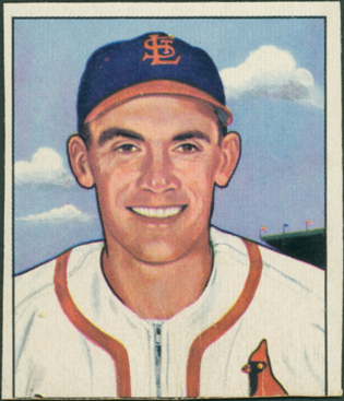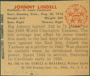 Portrait of Johnny Lindell, outfielder for the St. Louis Cardinals. Bowman series. Printed on back: "Johnny Lindell. Outfield, St. Louis Cardinals. Born: Greeley, Colo., Aug. 30, 1916. Height: 6-4. Weight: 205. Bats: right. Throws: right. Big Johnny batted .242 in 78 games for the 1949 World Champion Yankees. The low average was offset by some timely hits made in the last days of the pennant race against the Red Sox. Joined the Yankees as a pitcher in 1942. Was placed in outfield when he developed hitting power. Spent 1945 in service. Switched to Cardinals early in 1950. No. 209 in the series of baseball picture cards. [Copyright] 1950 Bowman Gum, Inc., Phila., Pa., U.S.A. Picture Card Collectors Club, 5-star Bowman series."