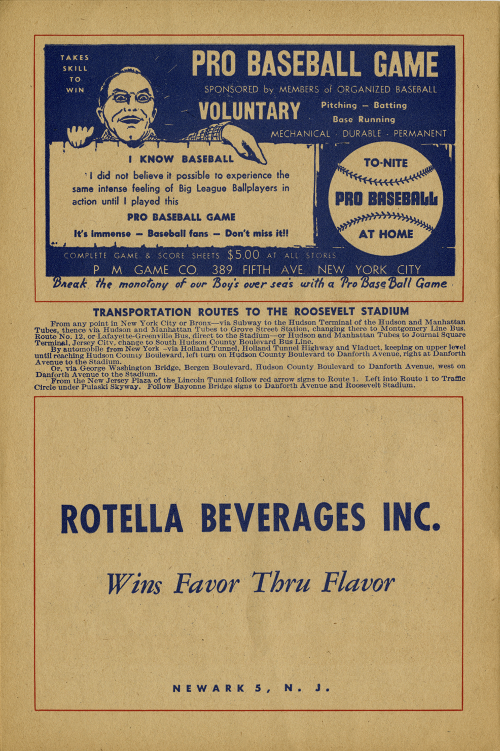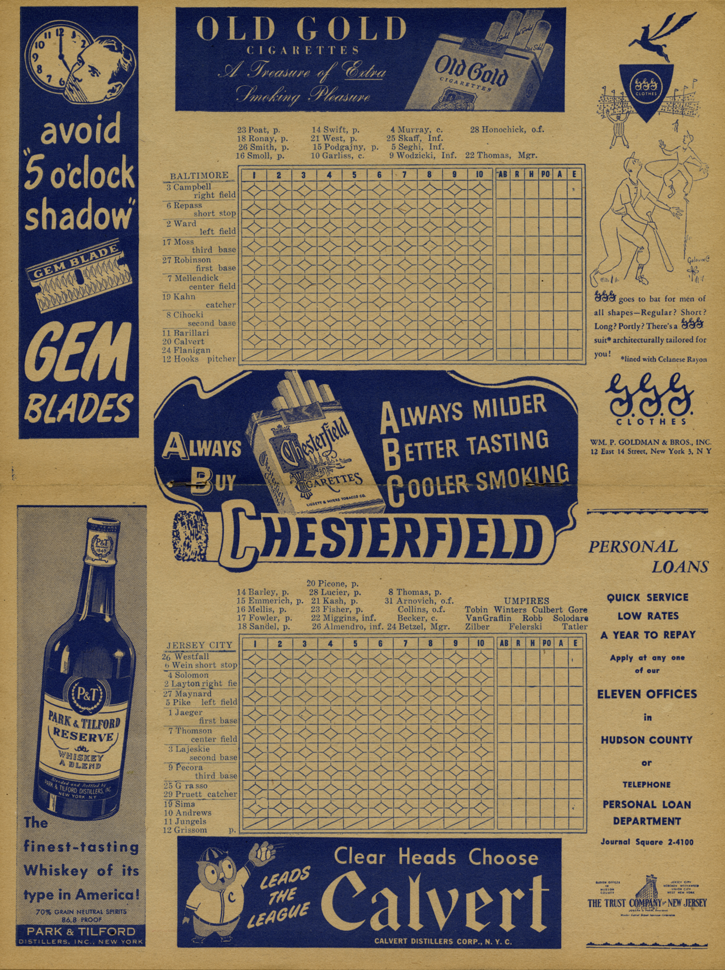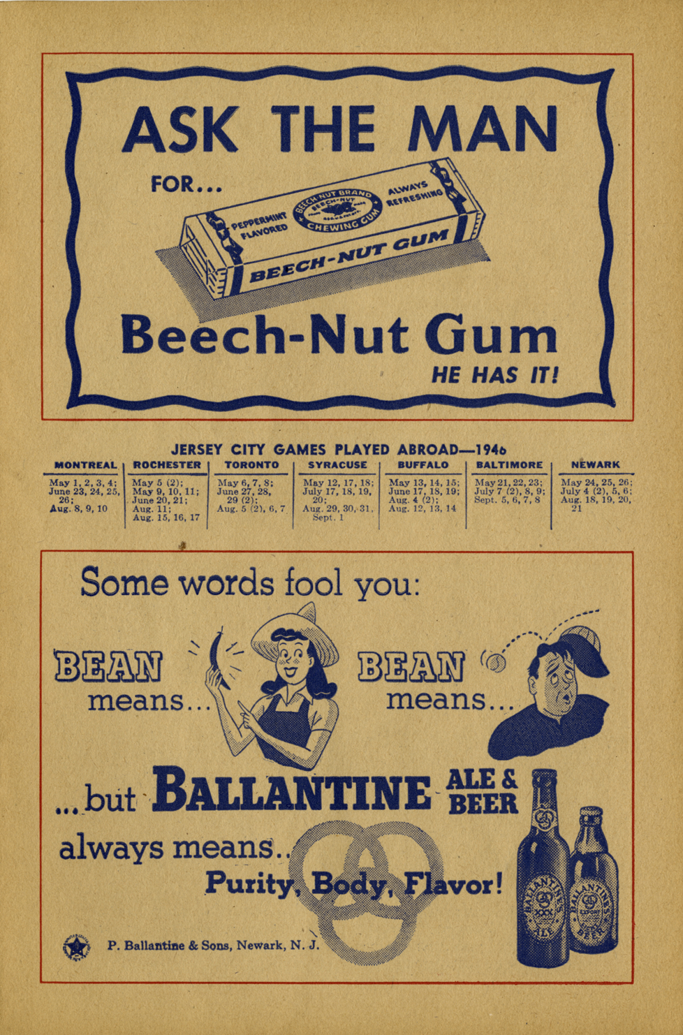 Scorecard for 1946 baseball game between Jersey City Giants and Baltimore Orioles. Printed on front: "1946 Jersey Giants, Roosevelt Stadium. Official program and score card, 10c." Cover depicts baseball player sliding into home plate. Scorecards for Jersey City and Baltimore, schedule and advertisements included in scorebook.