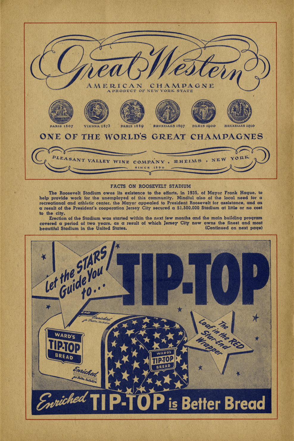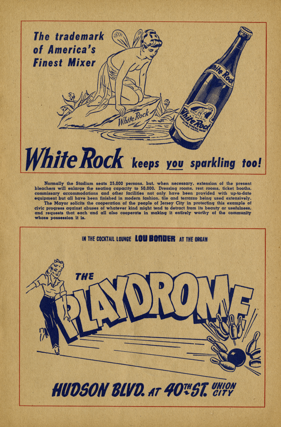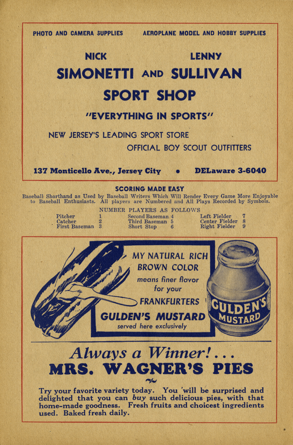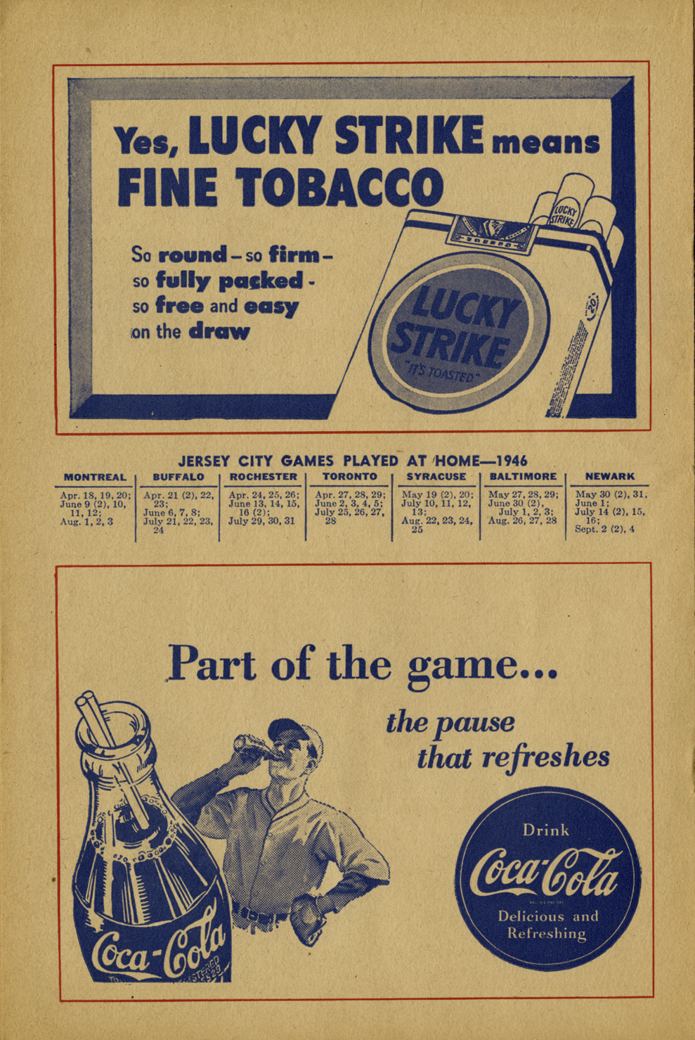 Scorecard for 1946 baseball game between Jersey City Giants and Baltimore Orioles. Printed on front: "1946 Jersey Giants, Roosevelt Stadium. Official program and score card, 10c." Cover depicts baseball player sliding into home plate. Scorecards for Jersey City and Baltimore, schedule and advertisements included in scorebook.