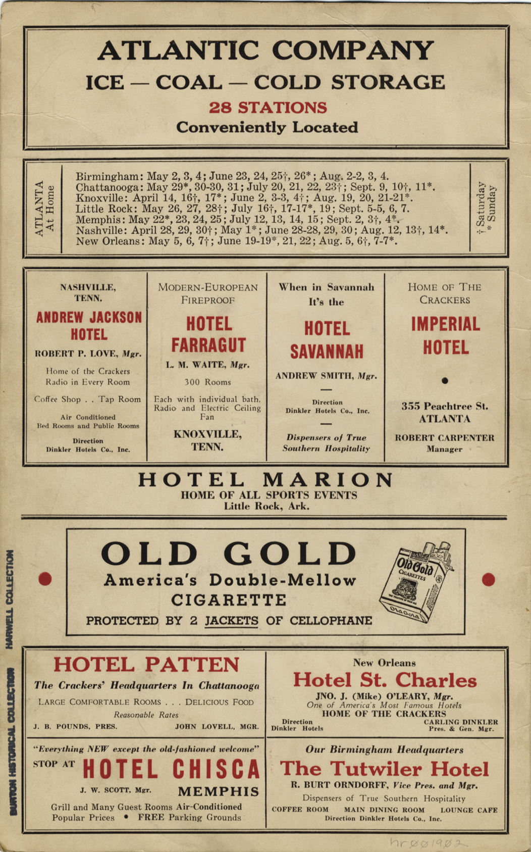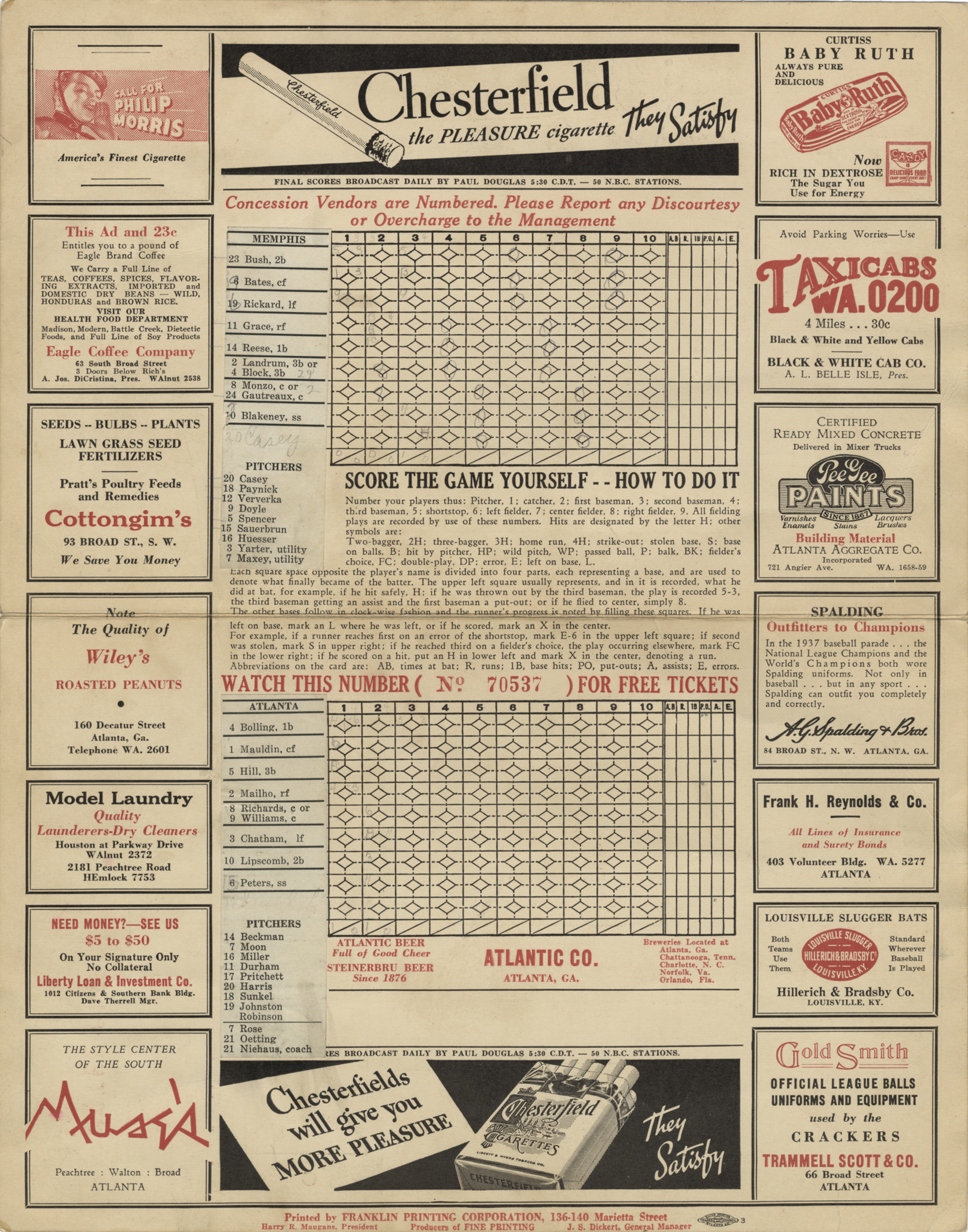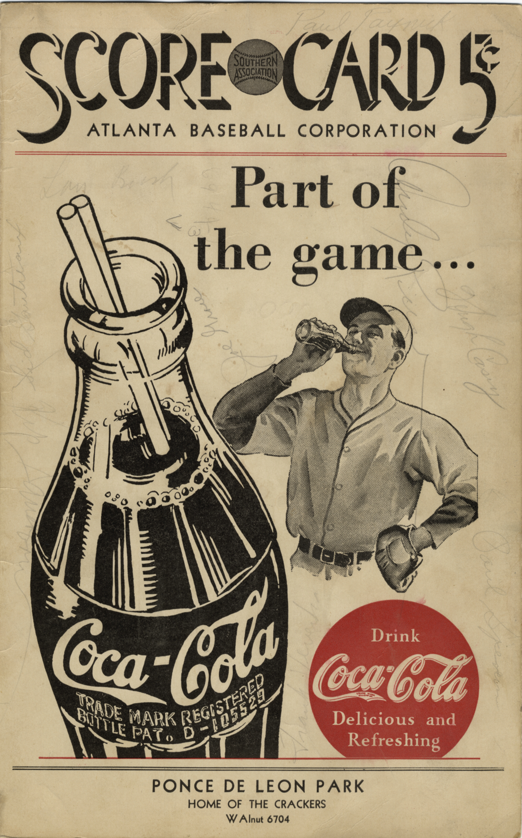 Scorecard for baseball game between Atlanta Crackers and Memphis Chicks. Advertisement for Coca-Cola on cover depicts baseball player drinking bottle of Coca-Cola. Printed on front: "Score card, Southern Association, Atlanta Baseball Corporation, 5 [cents]. Part of the game, drink Coca-Cola, delicious and refreshing. Ponce de Leon Park, home of the Crackers. Walnut 6704." Scorecards for Atlanta and Memphis, schedules and advertisements included in scorebook. Penciled notations on cover and scorecard.