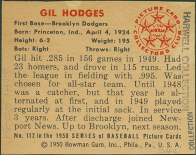 Portrait of Gil Hodges, first baseman for the Brooklyn Dodgers. Bowman series. Printed on back: "Gil Hodges. First base, Brooklyn Dodgers. Born: Princeton, Inc., April 4, 1924. Height: 6-2. Weight: 195. Bats: right. Throws: right. Gil hit .285 in 156 games in 1949. Had 23 homers, and drove 115 runs. Led the league in fielding with .995. Was chosen for all-star team. Until 1948 was a catcher, but that year he alternated at first, and in 1949 played regularly at the initial sack. In service 3 years. After discharge joined Newport News. Up to Brooklyn, next season. No. 112 in the 1950 series of baseball picture cards. [Copyright] 1950 Bowman Gum, Inc., Phila., Pa., U.S.A. Picture Card Collectors Club, 5-star Bowman series."