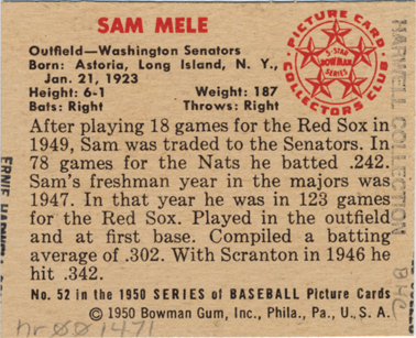 Portrait of Sam Mele, outfielder for the Washington Senators. Bowman series. Printed on back: "Sam Mele. Outfield, Washington Senators. Born: Astoria, Long Island, N.Y., Jan. 21, 1923. Height: 6-1. Weight: 187. Bats: right. Throws: right. After playing 18 games for the Red Sox in 1949, Sam was traded to the Senators. In 78 games for the Nats he batted .242. Sam's freshman year in the majors was 1947. In that year he was in 123 games for the Red Sox. Played in the outfield and at first base. Compiled a batting average of .302. With Scranton in 1946 he hit .342. No. 52 in the 1950 series of baseball picture cards. [Copyright] 1950 Bowman Gum, Inc., Phila., Pa., U.S.A. Picture Card Collectors Club, 5-star Bowman series."