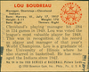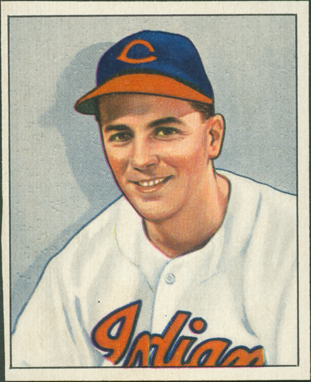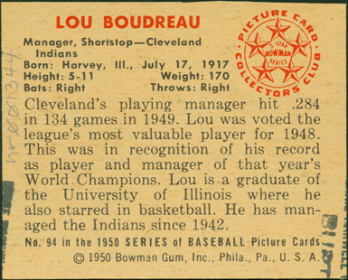 Portrait of Lou Boudreau, manager and shortstop for the Cleveland Indians. Bowman series. Printed on back: "Lou Boudreau, manager, shortstop, Cleveland Indians. Born: Harvey, Ill., July 17, 1917. Height: 5-11. Weight: 170. Bats: right. Throws: right. Cleveland's playing manager hit .284 in 134 games in 1949. Lou was voted the league's most valuable player for 1948. This was in recognition of his record as player and manager of that year's World Champions. Lou is a graduate of the University of Illinois where he also starred in basketball. He has managed the Indians since 1942. No. 94 in the 1950 series of baseball picture cards. [Copyright] 1950 Bowman Gum, Inc., Phila., Pa., U.S.A. Picture Card Collectors Club, 5-star Bowman series."