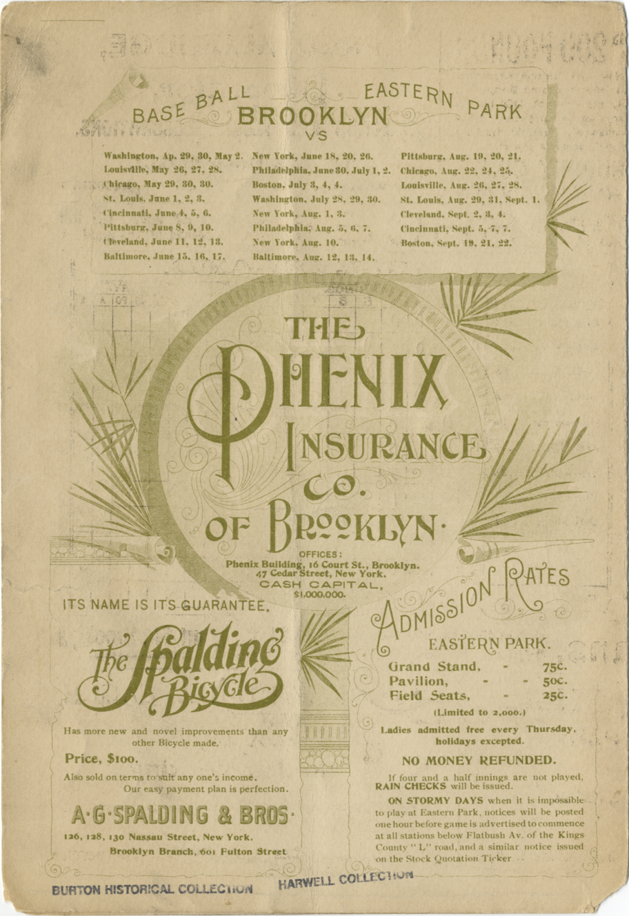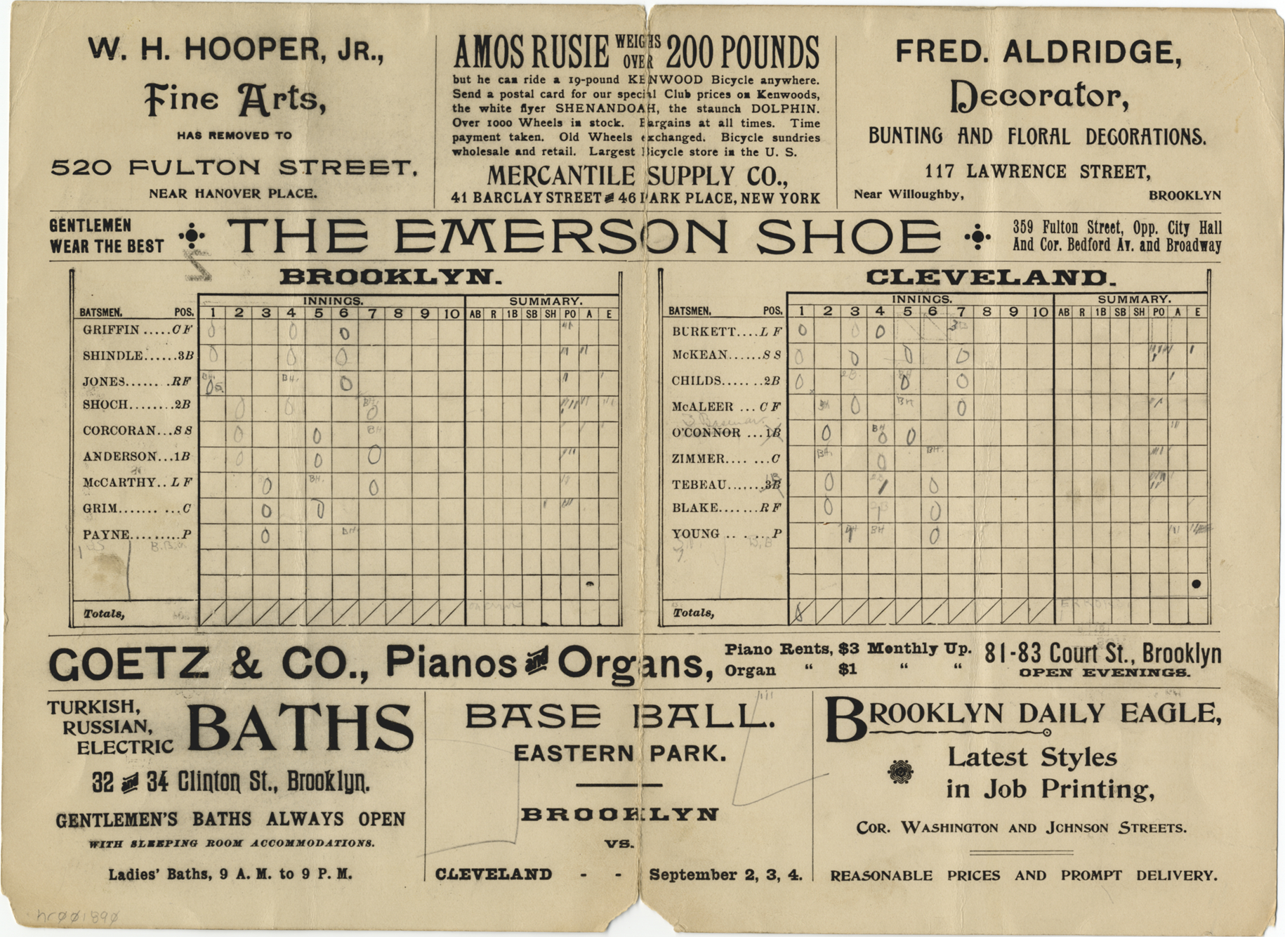 Scorecard for 1896 baseball game between Brooklyn Bridegrooms and Cleveland Spiders; advertisements printed on borders. Printed on front cover: "Official score card, Brooklyn baseball club, Eastern Park, 1896. Price 5 cents." Handwritten on front cover: "Brooklyn, Sept. 2, 1896." Printed inside: "Brooklyn, Cleveland." Back cover lists Brooklyn baseball schedule and Eastern Park admission prices.