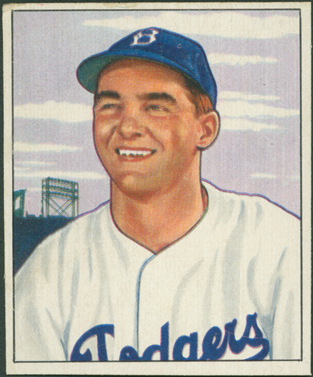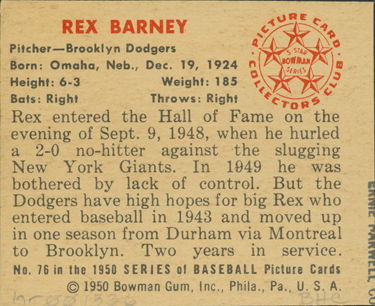 Portrait of Rex Barney, pitcher for the Brooklyn Dodgers. Bowman series. Printed on back: "Rex Barney. Pitcher, Brooklyn Dodgers. Born: Omaha, Neb., Dec. 19, 1924. Height: 6-3. Weight: 185. Bats: right. Throws: right. Rex entered the Hall of Fame on the evening of Sept. 9, 1948, when he hurled a 2-0 no-hitter against the slugging New York Giants. In 1949 he was bothered by lack of control. But the Dodghers have high hopes for big Rex who entered baseball in 1943 and moved up in one season from Durham via Montreal to Brooklyn. Two years in service. No. 76 in the 1950 series of baseball picture cards. [Copyright] 1950 Bowman Gum, Inc., Phila., Pa., U.S.A. Picture Card Collectors Club, 5-star Bowman series."