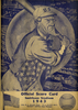Scorecard for 1943 baseball game between Knoxville Smokies and Nashville Vols. Cover depicts Uncle Sam holding a baseball bat; artwork signed "Valentine." Printed on front: "Official score card, Smithson Stadium, 1943. Col. R.G. Allen, pres. E.G. Allen, Sec'y., Buddy Lewis, team manager." Scorecards for Knoxville and Nashville, Southern Association schedule and advertisements included in scorecard.