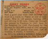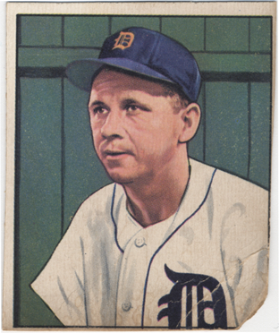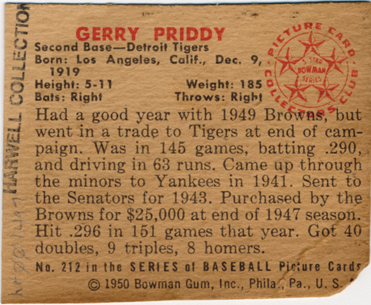 Portrait of Jerry Priddy, second baseman for the Detroit Tigers. Bowman series. Printed on back: "Gerry Priddy. Second base, Detroit Tigers. Born: Los Angeles, Calif., Dec. 9, 1919. Height: 5-11. Weight: 185. Bats: right. Throws: right. Had a good year with 1949 Browns, but went in a trade to Tigers at end of campaign. Was in 145 games, batting .290, and driving in 63 runs. Came up through the minors to Yankees in 1941. Sent to the Senators for 1943. Purchased by the Browns for $25,000 at end of 1947 season. Hit .296 in 151 games that year. Got 40 doubles, 9 triples, 8 homers. No. 212 in the series of baseball picture cards. [Copyright] 1950 Bowman Gum, Inc., Phila., Pa., U.S.A. Picture Card Collectors Club, 5-star Bowman series."