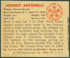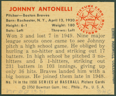 Portrait of Johnny Antonelli, pitcher for the Boston Braves. Bowman series. Printed on back: "Johnny Antonelli. Pitcher, Boston Braves. Born: Rochester, N.Y., April 12, 1930. Height: 6-1. Weight: 180. Bats: left. Throws: left. Won 3 and lost 7 in 1949. Nine major league scouts once came to see Johnny pitch a high school game. He obliged by hurling a no-hitter and striking out 17 batters. In high school he pitched 3 no-hitters and 5 1-hitters, striking out 231 batters in 103 innings, giving up only 36 hits. Braves landed him with a big bonus. He joined them late in 1948. No. 74 in the 1950 series of baseball picture cards. [Copyright] 1950 Bowman Gum, Inc., Phila., Pa., U.S.A. Picture Card Collectors Club, 5-star Bowman series."