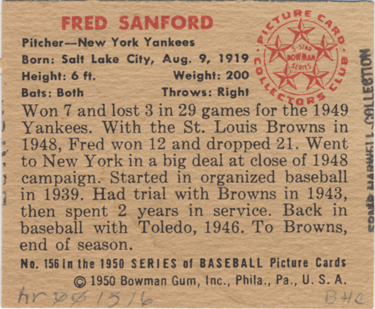 Portrait of Fred Sanford, pitcher for the New York Yankees. Bowman series. Printed on back: "Fred Sanford. Pitcher, New York Yankees. Born: Salt Lake City, Aug. 9, 1919. Height: 6 ft. Weight: 200. Bats: both. Throws: right. Won 7 and lost 3 in 29 games for the 1949 Yankees. With the St. Louis Browns in 1948, Fred won 12 and dropped 21. Went to New York in a big deal at close of 1948 campaign. Started in organized baseball in 1939. Had trial with Browns in 1943, then spent 2 years in service. Back in baseball with Toledo, 1946. To Browns, end of season. No. 156 in the 1950 series of baseball picture cards. [Copyright] 1950 Bowman Gum, Inc., Phila., Pa., U.S.A. Picture Card Collectors Club, 5-star Bowman series."