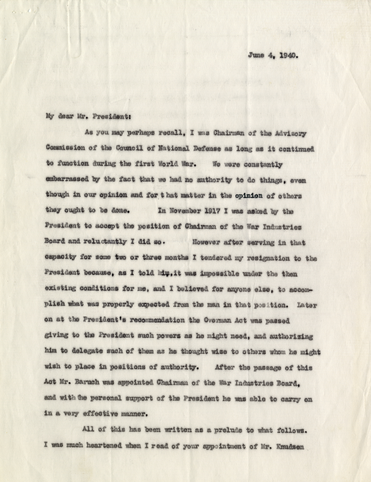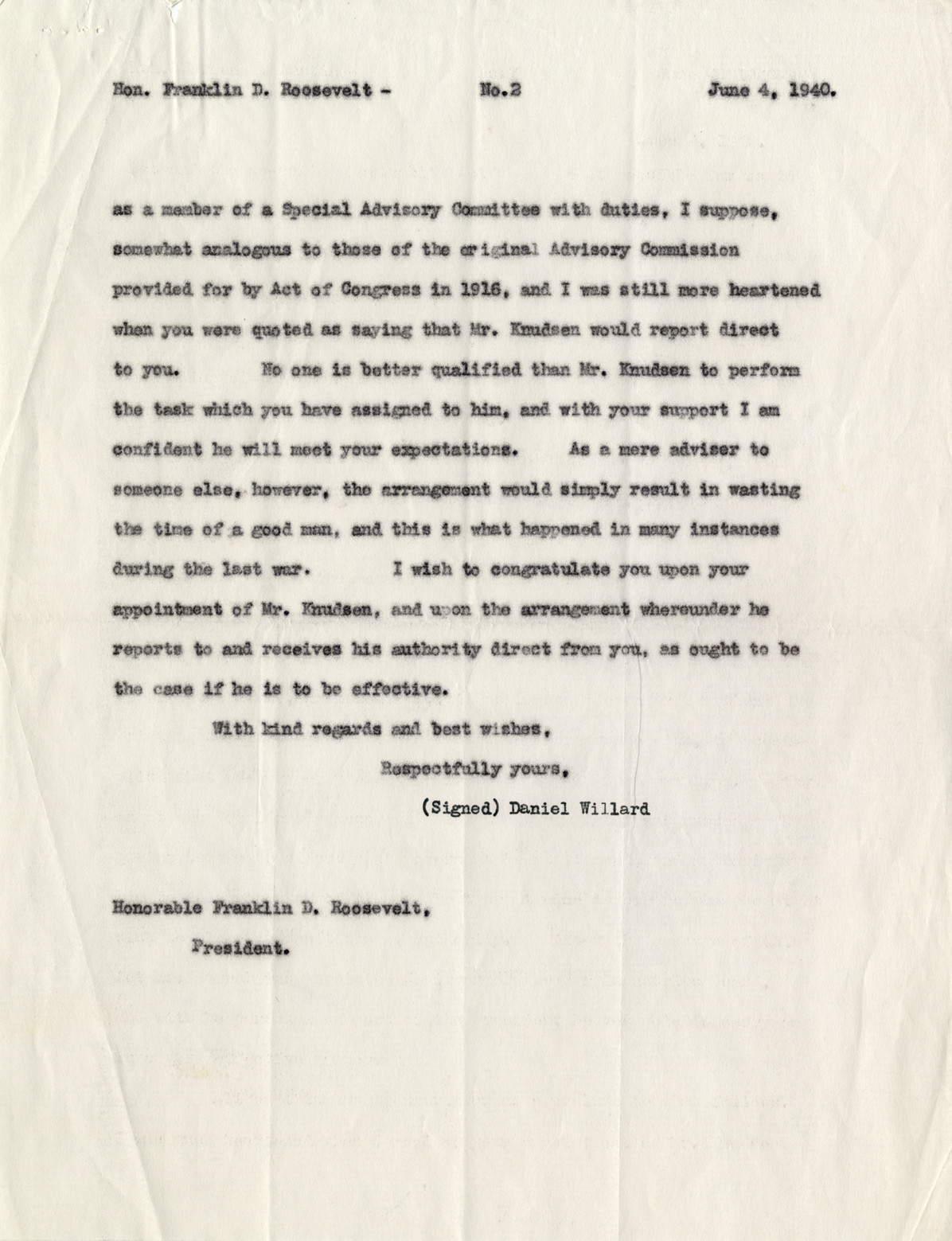 Copy of letter from Daniel Willard congratulating President Franklin D. Roosevelt on his appointment of William S. Knudsen as a member of a Special Advisory Committee.