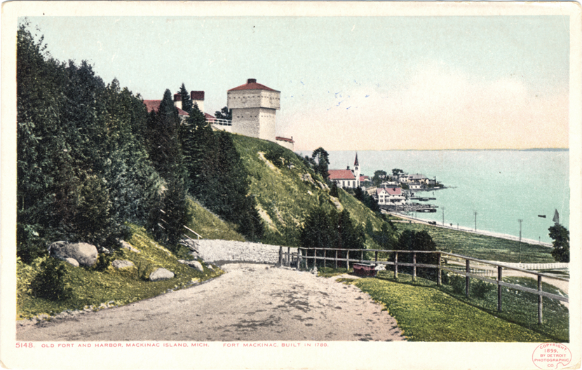 View of fort and blockhouse on side of hill at Mackinac Island. Town and harbor in background; road in foreground. Printed on front: "Old Fort and harbor, Mackinac Island, Mich. Fort Mackinac built in 1780, 5148. Copyright 1899 by Detroit Photographic Co."
