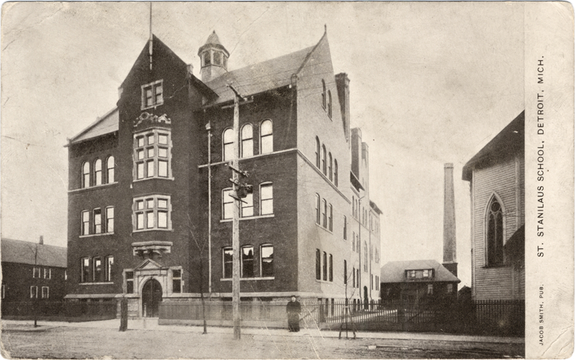 View of St. Stanislaus School; three-story brick building with cupola. Man wearing long robes, possibly a priest, poses in front of school. Printed on front: "St. Stanilaus [sic] School, Detroit, Mich., Jacob Smith, pub."