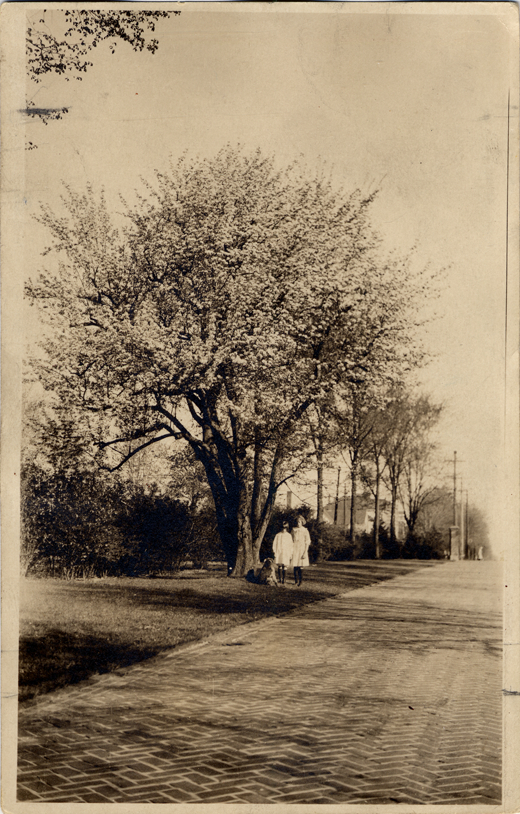 View of two girls and a dog standing underneath a French pear tree, alongside herringbone-paved brick path. Handwritten on back: "French pear tree in D.M. Ferry's yard. His two grandchildren under tree."