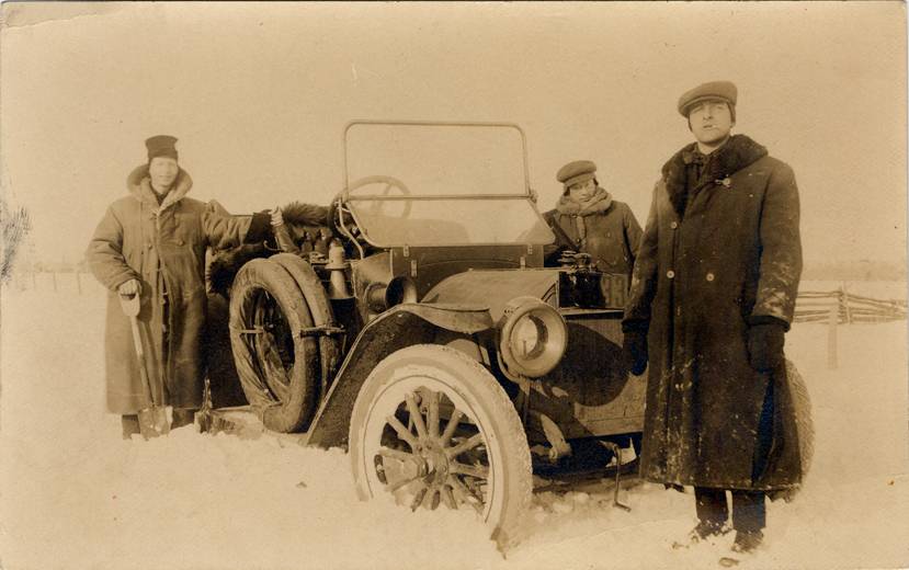 Three men in overcoats and caps standing around car stuck in snow. One man holds shovel. License plate above front grille reads "Ont. 1913. 5333."