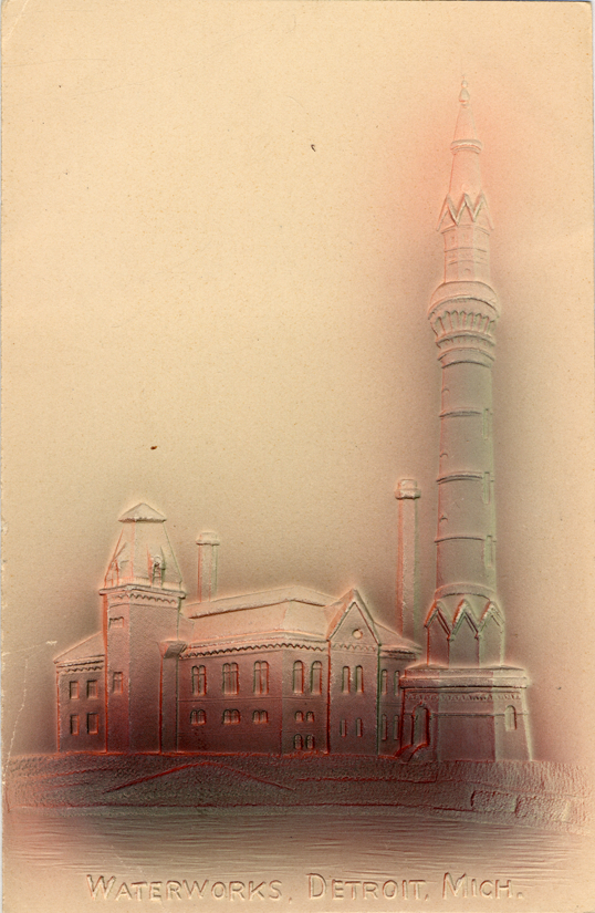 Raised illustration of waterworks in Waterworks Park, including water tower. Printed on front: "Waterworks, Detroit, Mich."
