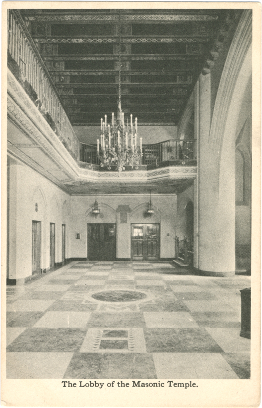 View of lobby of Masonic Temple; hall has coffered ceiling, marble floor and second floor balcony. Chandelier is suspended from ceiling. Printed on front: "The lobby of the Masonic Temple."
