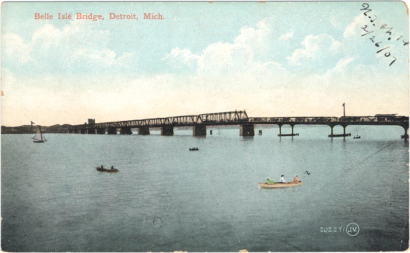 View of Belle Isle Bridge; truss bridge spans Detroit River. Boats in foreground. Printed on front: "Belle Isle Bridge, Detroit, Mich., 202,241." Handwritten on front: "N.J.W. 79, 2/26/07." Printed on back: "Published by Wolverine News Co., Detroit, Mich. Printed in Great Britain."