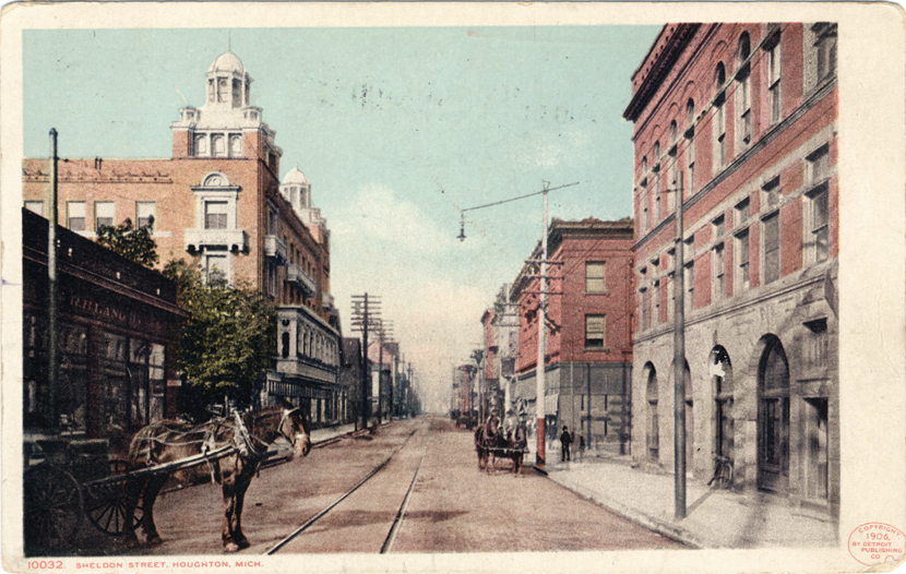 View of Sheldon St. in Houghton, Michigan. Commercial buildings line street; horse-drawn wagon in foreground. Printed on front: "10032, Sheldon Street, Houghton, Mich. Copyright 1906 by Detroit Publishing Co." Printed on back: "Phostint card made only by Detroit Publishing Co." Card is postmarked August 21, 1907.