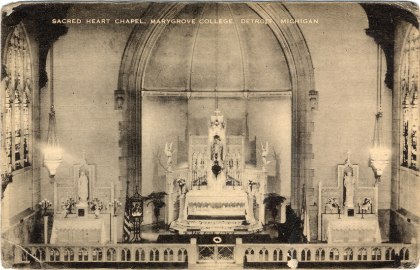 View of interior of Sacred Heart Chapel at Marygrove College depicting altarpieces with statuary; stained glass windows on sides of chapel. Printed on front: "Sacred Heart Chapel, Marygrove College, Detroit, Michigan." Printed on back: "Artvue Post Card Co., 225 Fifth Ave., New York, N.Y."