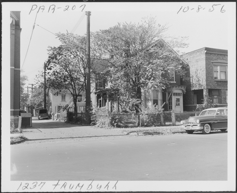 Front and side view of two-story brick Italianate house with bay window located at 1237 Trumbull, parcel 207, in Corktown. House is adjacent to alley; chain link fence surrounds front yard; house is partially obscured by trees. Handwritten on front: "Par. 207, 1237 Trumbull, 10-8-56."