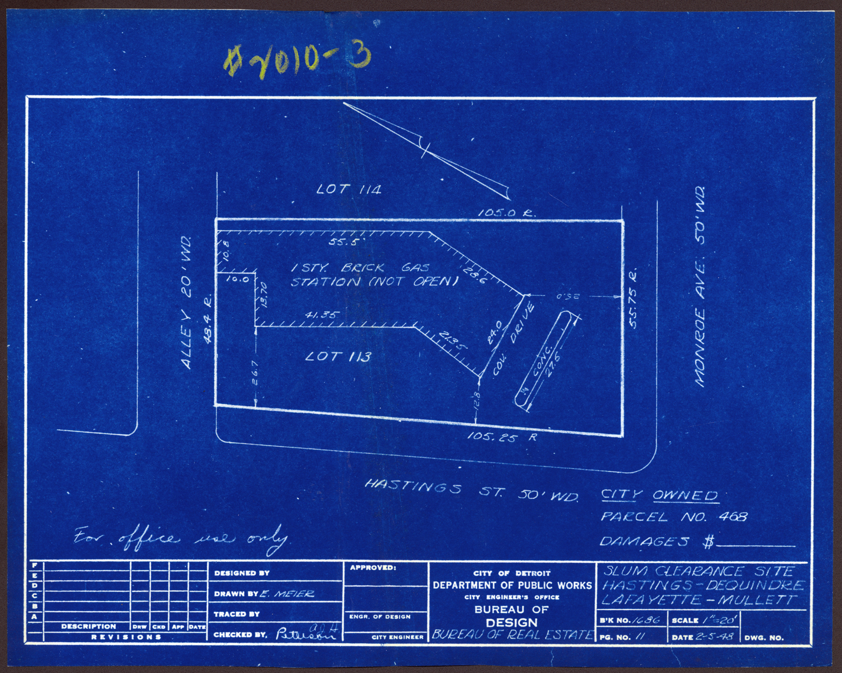 Plot plan for property located on the corner of Hastings and Monroe, city owned parcel 468. Recorded on blueprint: "Slum clearance site; Hastings, Dequindre, Lafayette, Mullett."
