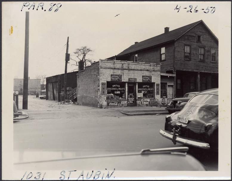 View of one-story brick building with storefront located at 1031 St. Aubin, parcel 88, in the area bounded by Dequindre/Chene/Lafayette/Monroe, site 2-S-4. Sign in window: "Smith's Groceries & Meats." Advertisements for Vernor's, Faygo, Nehi, NuGrape and Coca-Cola on store. Automobile bumper in foreground. Handwritten on front: "Par. 88, 1031 St. Aubin, 4-26-50."