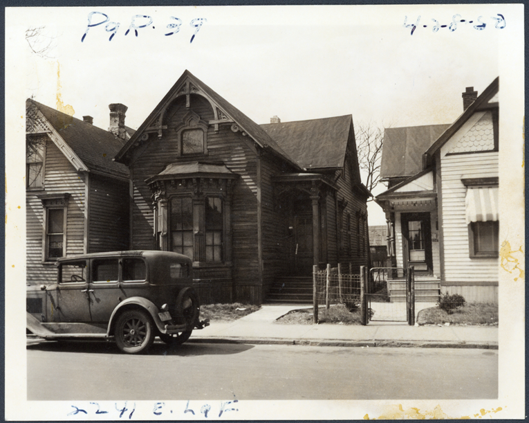 View of one-story wooden-frame house located at 2241 E. Lafayette, parcel 39, in the area bounded by Dequindre/Chene/Lafayette/Monroe, site 2-S-4. House has bay window and decorative vergeboards; car parked in street. Handwritten on front: "Par. 39, 2241 E. Laf., 4-28-50."