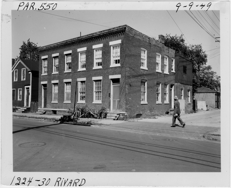 Front and side view of two-story brick building, possibly apartments or a duplex, located at 1224-1230 Rivard, parcel 550, in the area bounded by Hastings/Dequindre/Monroe/Macomb. Man walks on sidewalk in front of alley. Handwritten on front: "Par. 550, 1224-30 Rivard, 9-9-49."