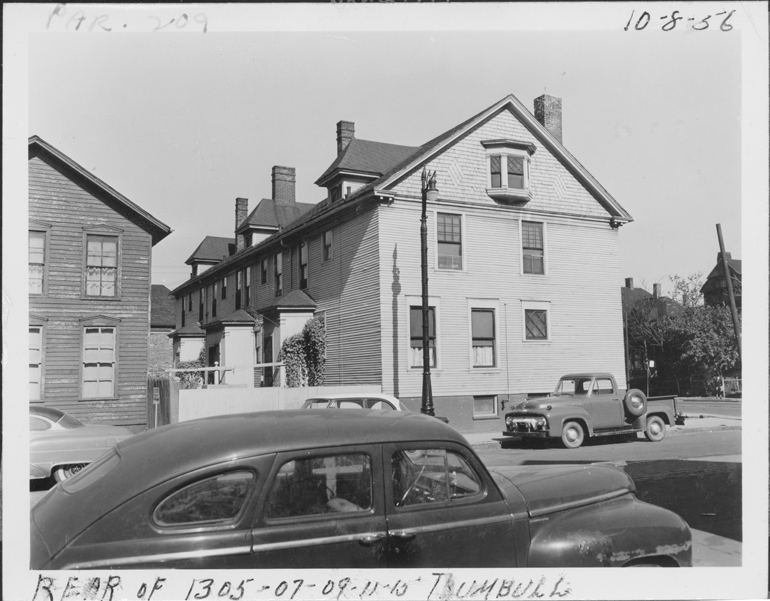 Side and rear view of two-story wooden-frame row houses located at 1305-1307-1309-1311-1315 Trumbull, parcel 209, in Corktown. Building is cross-gabled with hipped dormers; automobiles and truck parked in street. Handwritten on front: "Par. 209, rear of 1305-07-09-11-15 Trumbull, 10-8-56."