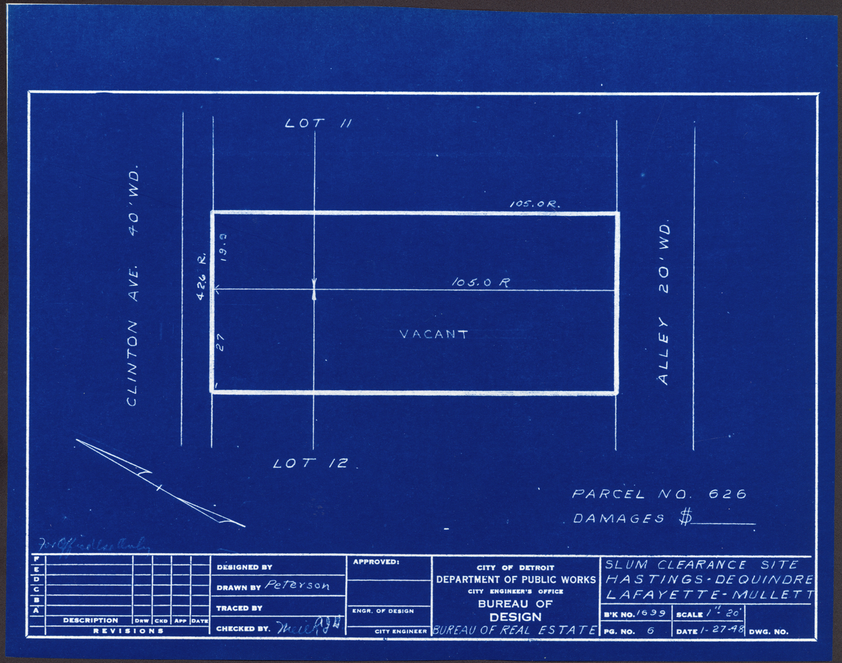 Plot plan for property located on Clinton, parcel 626. Recorded on blueprint: "Slum clearance site; Hastings, Dequindre, Lafayette, Mullett."