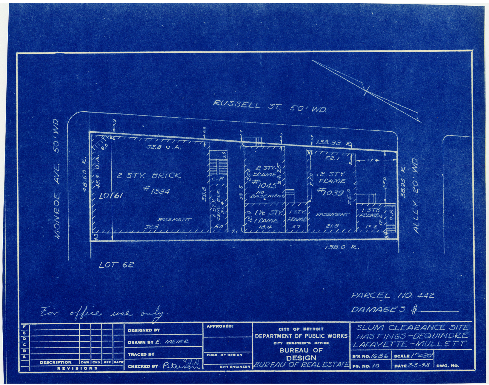 Plot plan for property located on the corner of Russell and Monroe, parcel 442. Recorded on blueprint: "Slum clearance site; Hastings, Dequindre, Lafayette, Mullett."