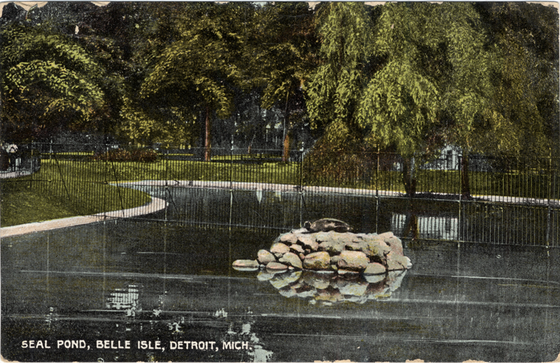 View of seal resting on rocks in the middle of a pond at Belle Isle Zoo. Pond is separated by fence; trees and lawns in background. Printed on front: "Seal pond, Belle Isle, Detroit, Mich." Printed on back: "Made expressly for S.H. Knox & Co. Printed in Germany." Handwritten on back: "3/15/09. This has been another fine day. Well I got up this morning at six o'clock and played ball for awhile and it seems to work pretty good. Played with J. Miller for awhile this afternoon. Everything O.K. E.A.S." Card is postmarked March 15, 1909.