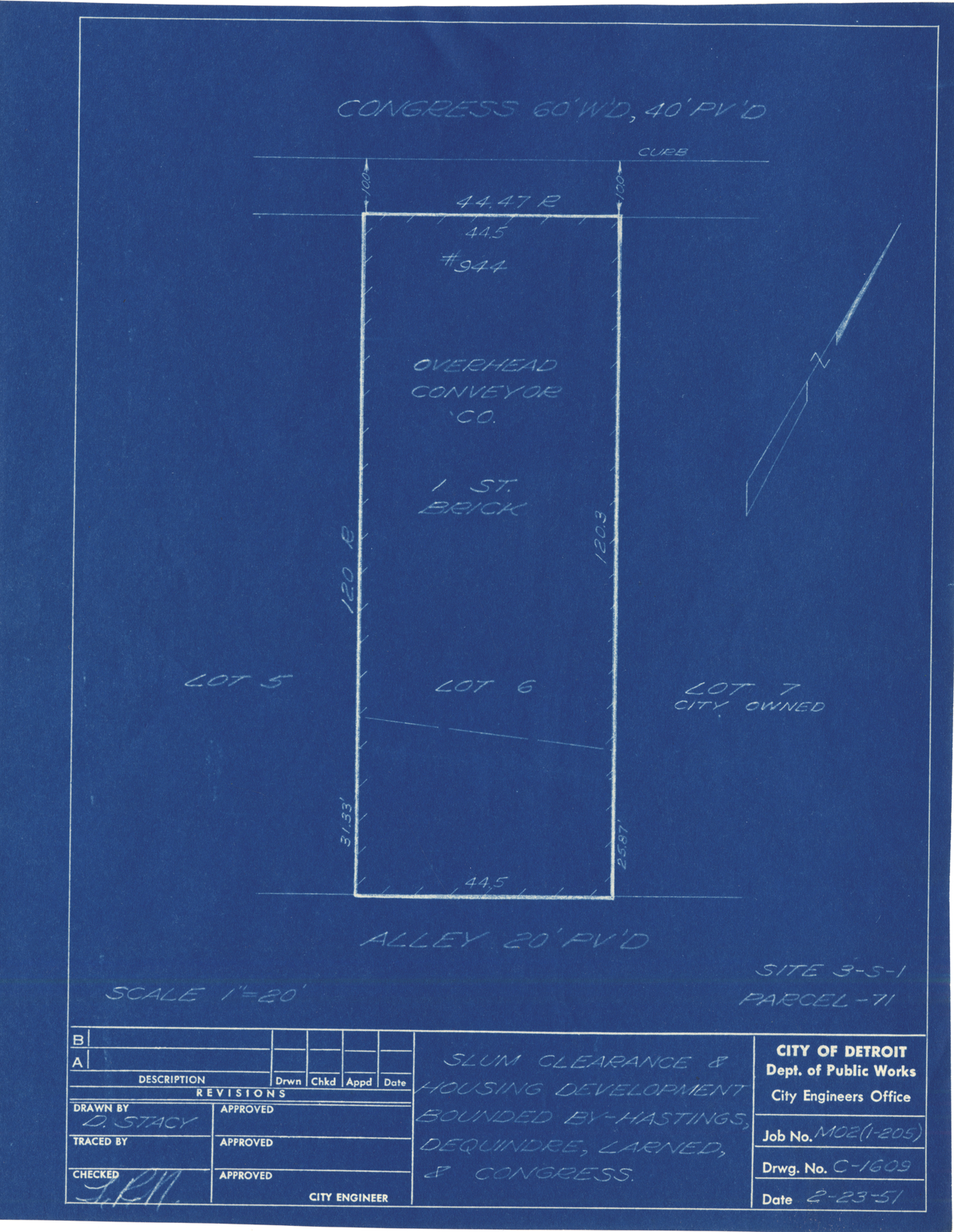 Plot plan for property located on Congress, parcel 71, site 3-S-1. Written on blueprint: "Overhead Conveyer Co." Recorded on blueprint: "Slum clearance & housing developm't bounded by Hastings, Dequindre, Larned & Congress."