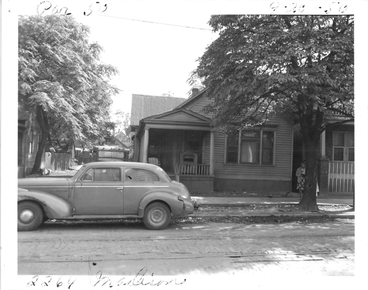 View of one-story wooden-frame house with covered entry porch located at 2264 Madison, parcel 50, in the area bounded by Dequindre/Chene/Mullett/Madison, site 2-S-8. Automobile parked on brick street. Handwritten on front: "Par. 50, 2264 Madison, 9-20-50."