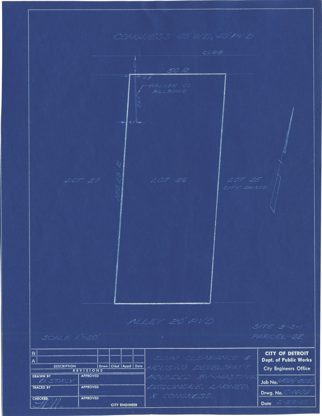 Plot plan for property located on Congress, parcel 65, site 3-S-1. Recorded on blueprint: "Slum clearance & housing developm't bounded by Hastings, Dequindre, Larned & Congress."