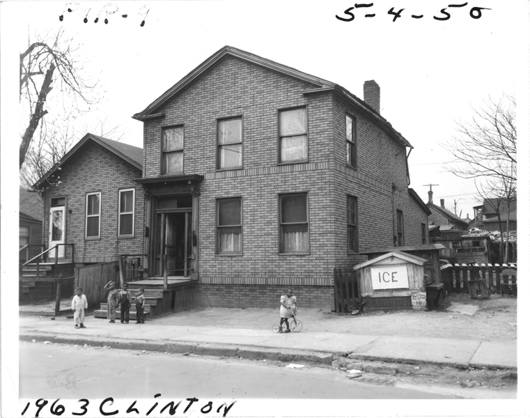 View of two-story house with simulated brick siding located at 1963 Clinton, parcel 9, in the area bounded by Dequindre/Chene/Clinton/Mullett, site 2-S-7. Group of children play on sidewalk, one child rides a tricycle; small structure with sign reading "Ice" adjacent to house. Handwritten on front: "Par. 9, 1963 Clinton, 5-4-50."