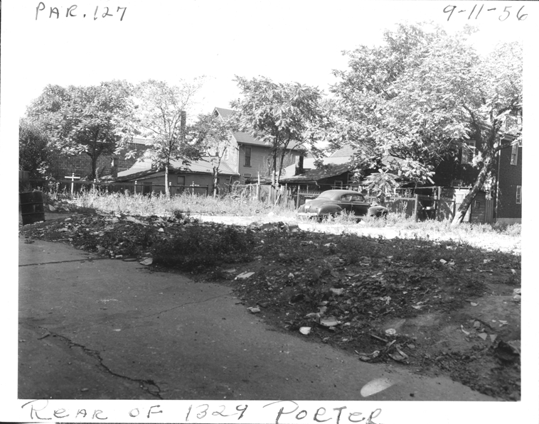 View of empty lot with weeds and debris located at the rear of 1329 Porter, parcel 127, in Corktown. Car parked in lot near fence; houses and trees in background. Handwritten on front: "Par. 127, rear of 1329 Porter, 9-11-56."