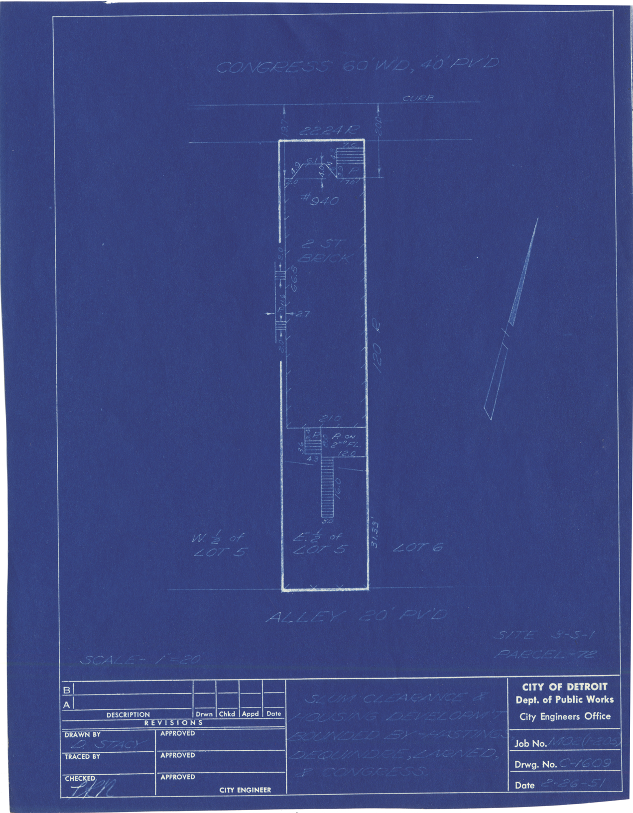 Plot plan for property located on Congress, parcel 72, site 3-S-1. Recorded on blueprint: "Slum clearance & housing developm't bounded by Hastings, Dequindre, Larned & Congress."