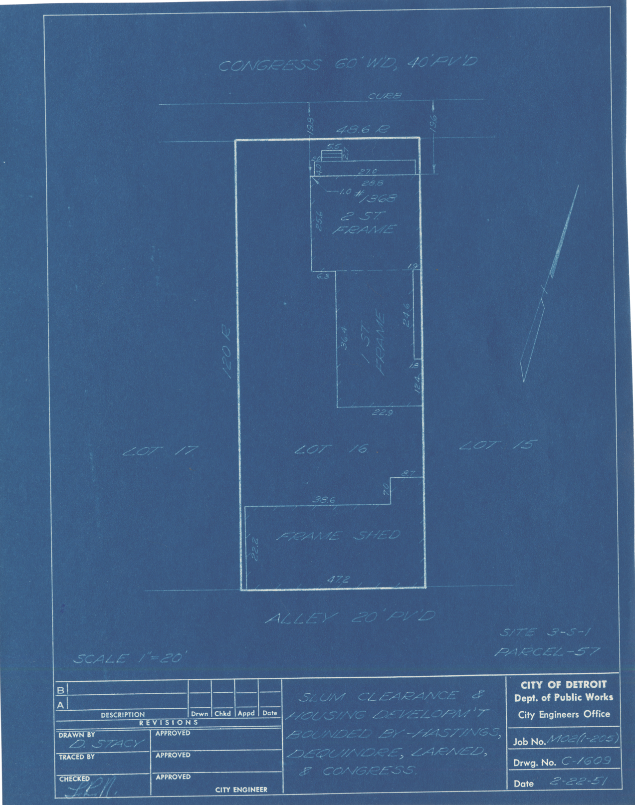 Plot plan for property located on Congress, parcel 57, site 3-S-1. Recorded on blueprint: "Slum clearance & housing development bounded by Hastings, Dequindre, Larned & Congress."