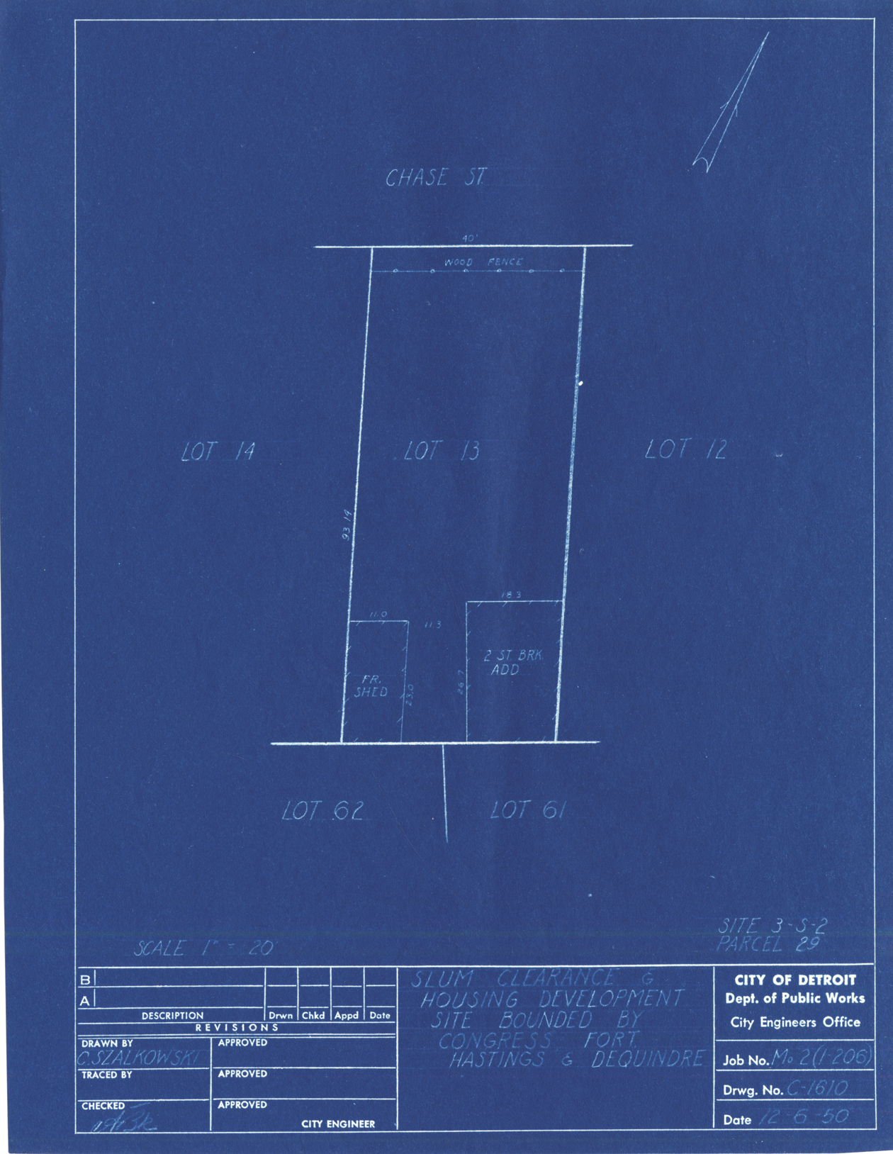 Plot plan for property located on Chase, parcel 29, site 3-S-2. Recorded on blueprint: "Slum clearance & housing development site bounded by Congress, Fort, Hastings & Dequindre."