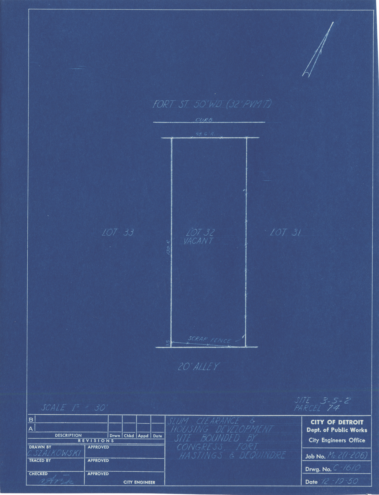 Plot plan for property located on Fort, parcel 74, site 3-S-2. Recorded on blueprint: "Slum clearance & housing development site bounded by Congress, Fort, Hastings & Dequindre."