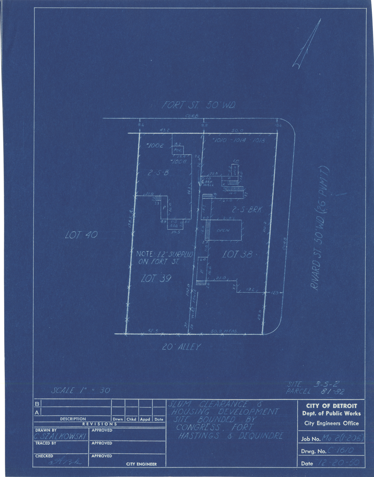 Plot plan for property located on the corner of Fort and Rivard, parcels 81-82, site 3-S-2. Recorded on blueprint: "Slum clearance & housing development site bounded by Congress, Fort, Hastings & Dequindre."