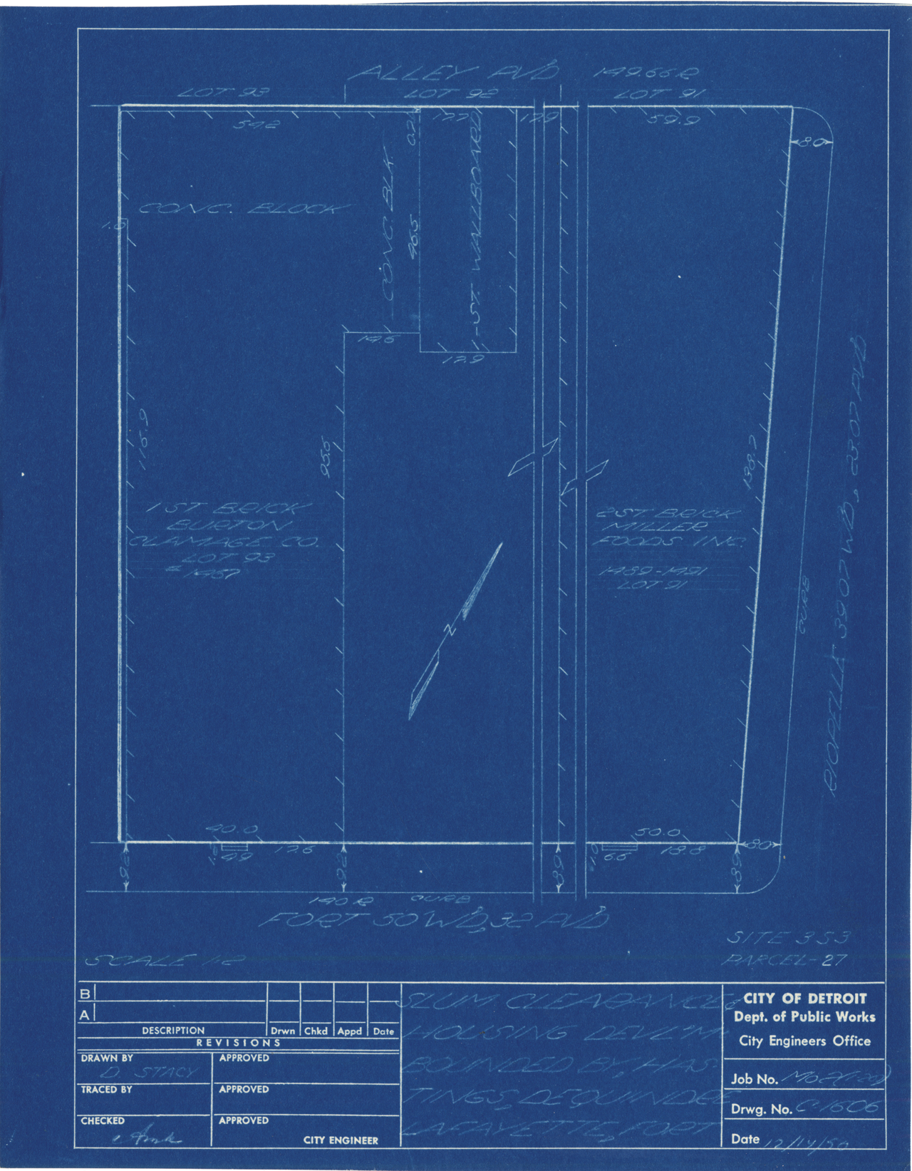 Plot plan for property located on the corner of Fort and Riopelle, parcel 27, site 3-S-3. Written on blueprint: "Burton Clamage [sic] Co.; Miller Foods, Inc." Recorded on blueprint: "Slum clearance & housing developm't bounded by Hastings, Dequindre, Lafayette, Fort."