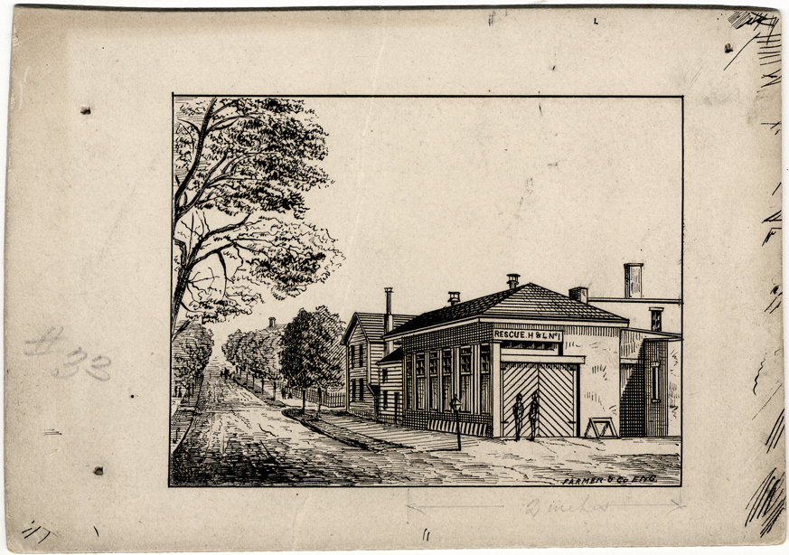 Pen and ink drawing of Washington Market; two men stand in front of large doors of wooden-frame building on corner. Two-story wooden-frame house adjacent to building on corner. Sign on building: "Rescue H & L No. 1." Printed in lower right corner of drawing: "Farmer & Co., Eng." Handwritten on back: "Old Washington Market, E. cor. Larned & Wayne."