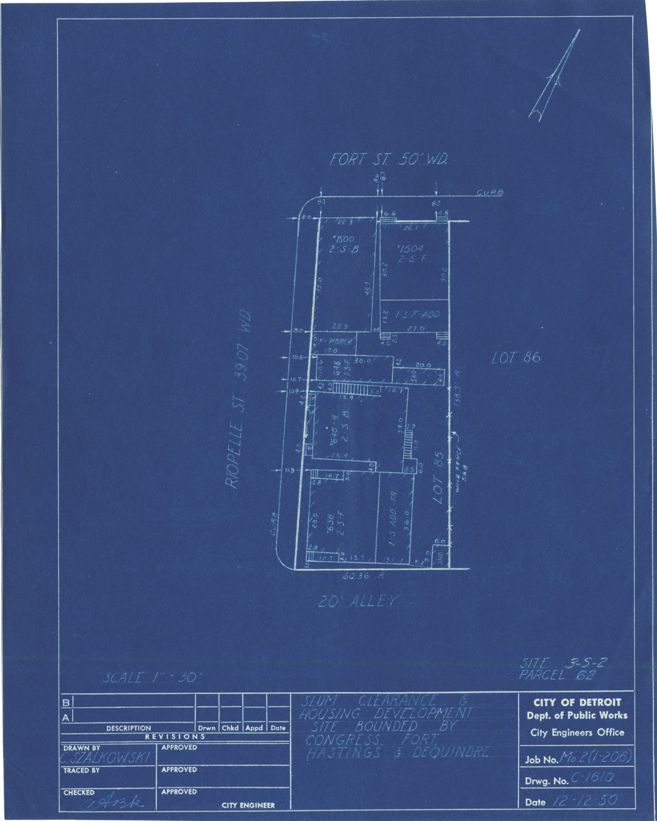 Plot plan for property located on Fort, parcel 62, site 3-S-2. Recorded on blueprint: "Slum clearance & housing development site bounded by Congress, Fort, Hastings & Dequindre."