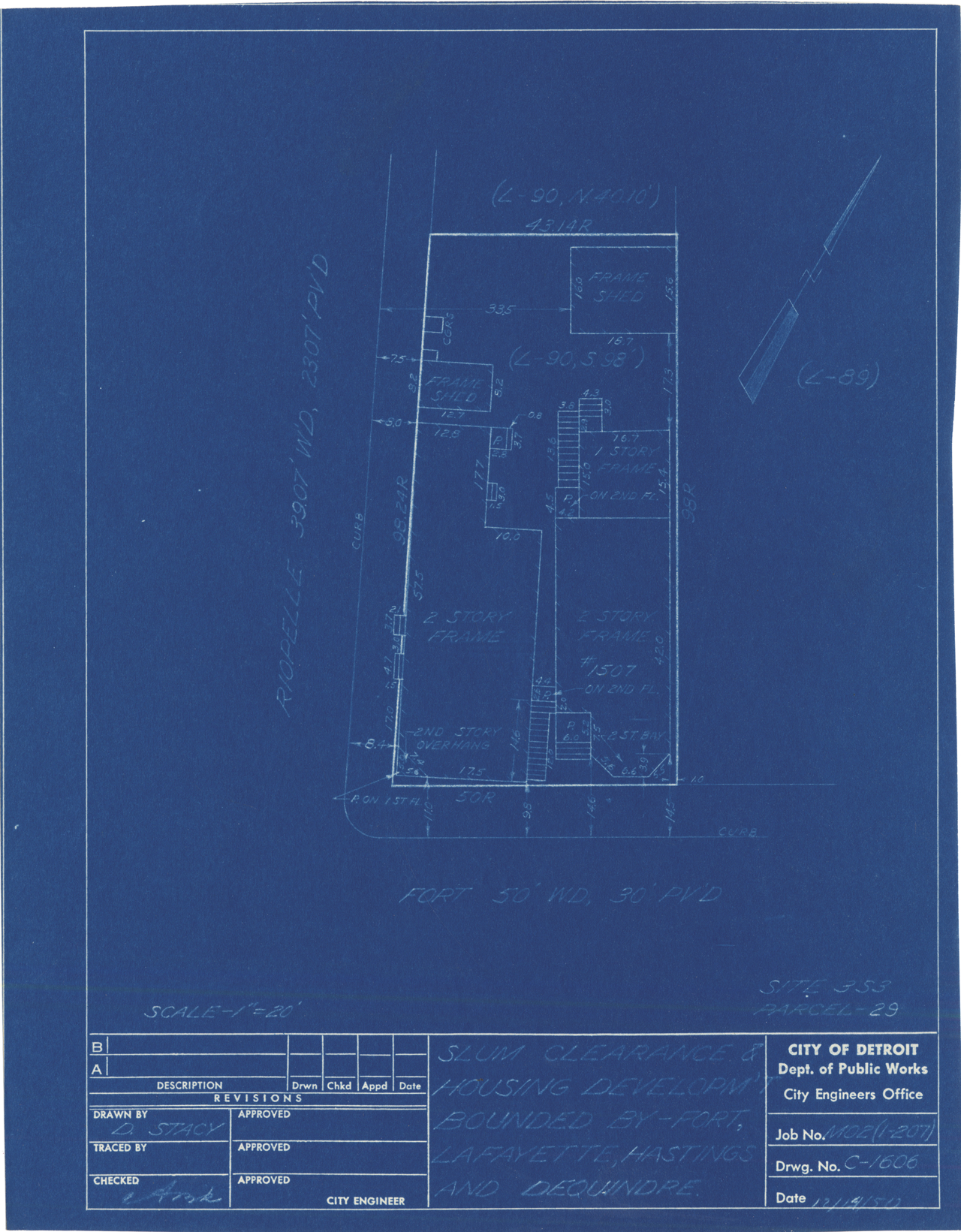 Plot plan for property located on the corner of Fort and Riopelle, parcel 29, site 3-S-3. Recorded on blueprint: "Slum clearance & housing developm't bounded by Fort, Lafayette, Hastings and Dequindre."