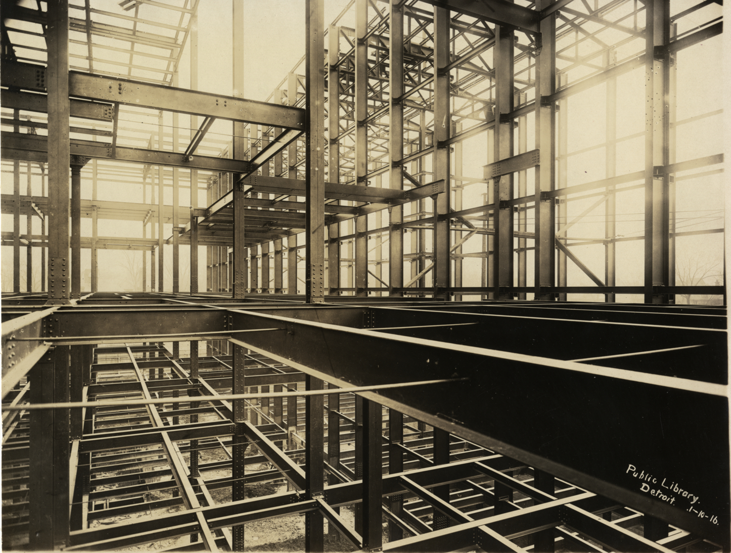 View from inside of framework of Main Library, Detroit Public Library during construction. Printed on front: "Public Library, Detroit. 1-10-16." Stamped on back: "Babcock and Dolbey, 92-94 Griswold St., Detroit, Mich., Cadillac 3189." Handwritten on back: "Second floor looking south-west."