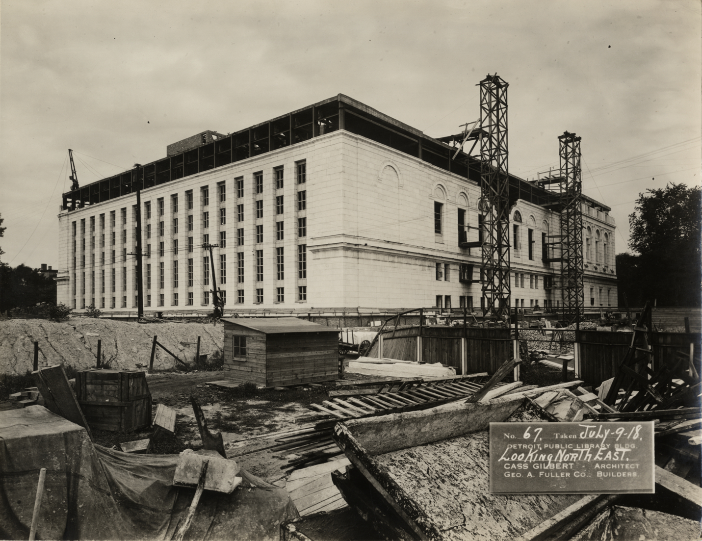 View at an angle of Main Library, Detroit Public Library during construction, facing northeast. Facade of building nearly complete; scaffolding on side. Wooden shed, fence and construction materials in foreground. Printed on front: "No. 67. Taken July-9-18. Detroit Public Library bldg., looking northeast. Cass Gilbert, architect. Geo. A. Fuller Co., builders."